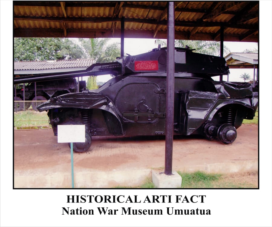 This is the picture of one the historical artifact (national war museum Umuahia) The Nigerian national war museum in Umuahia showcases the military history of Nigeria with relics form the Biafra-Nigerian civil war. It has a collection of tanks, armored vehicles, ships, and aircraft all from Nigeria or the defunct Republic of Biafra.