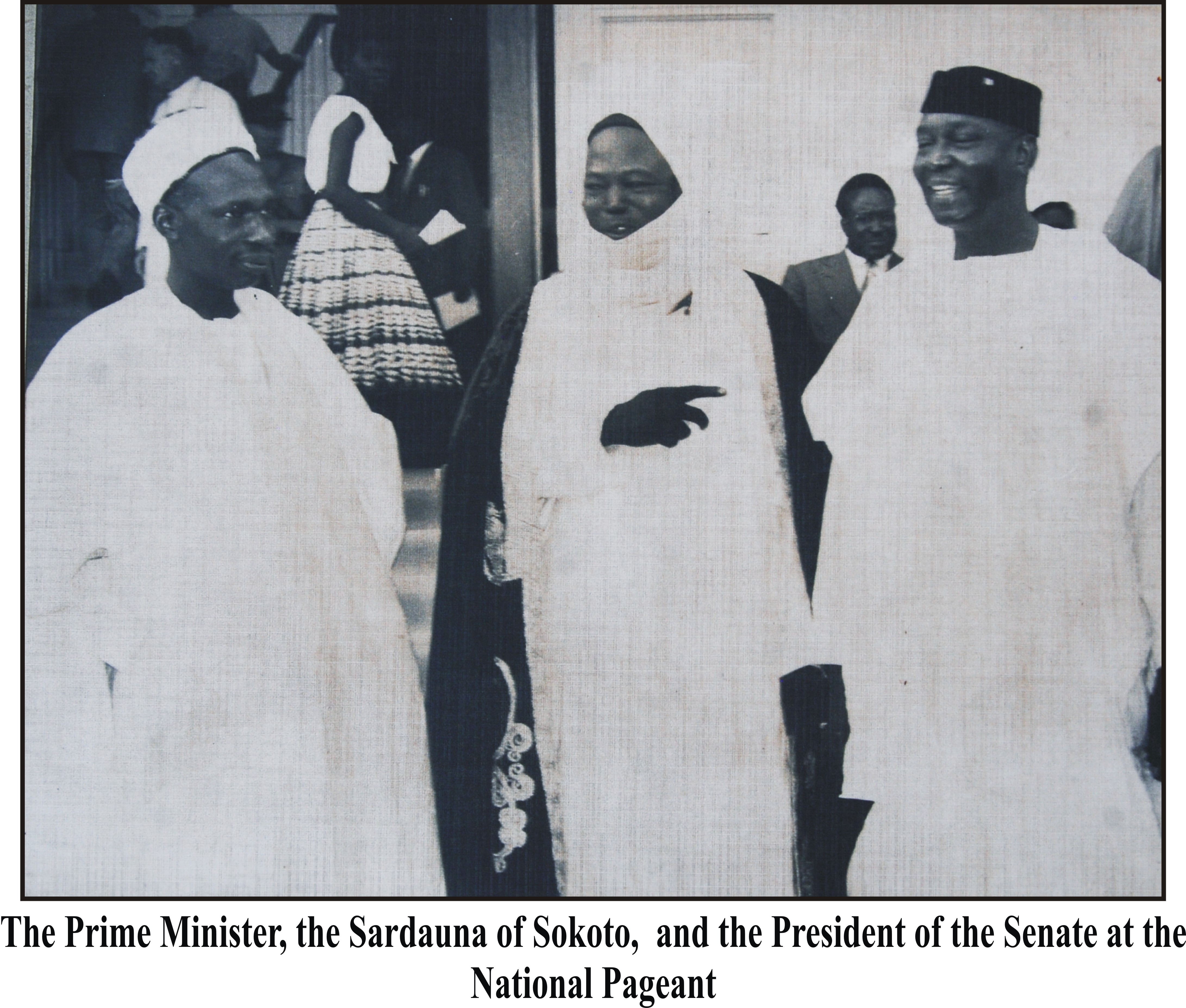 A picture of the prime minister, the sarduna of Sokoto and the president of the senate at the national pegeant.