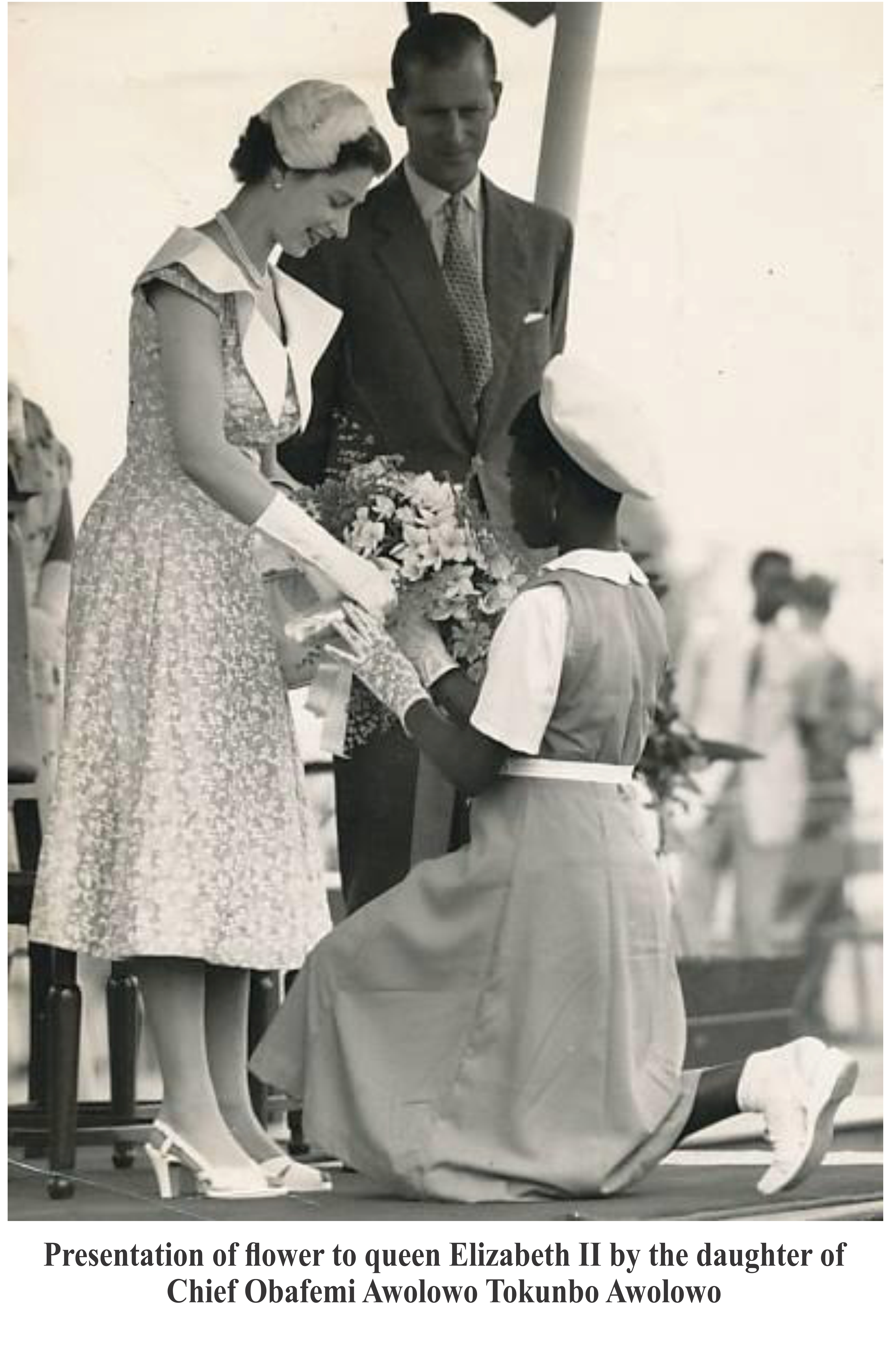 This is the Picture of presentation of flower to Queen Elizabeth II by the daughter of Chief Obafemi Awolowo, Tokunbo Awolowo.