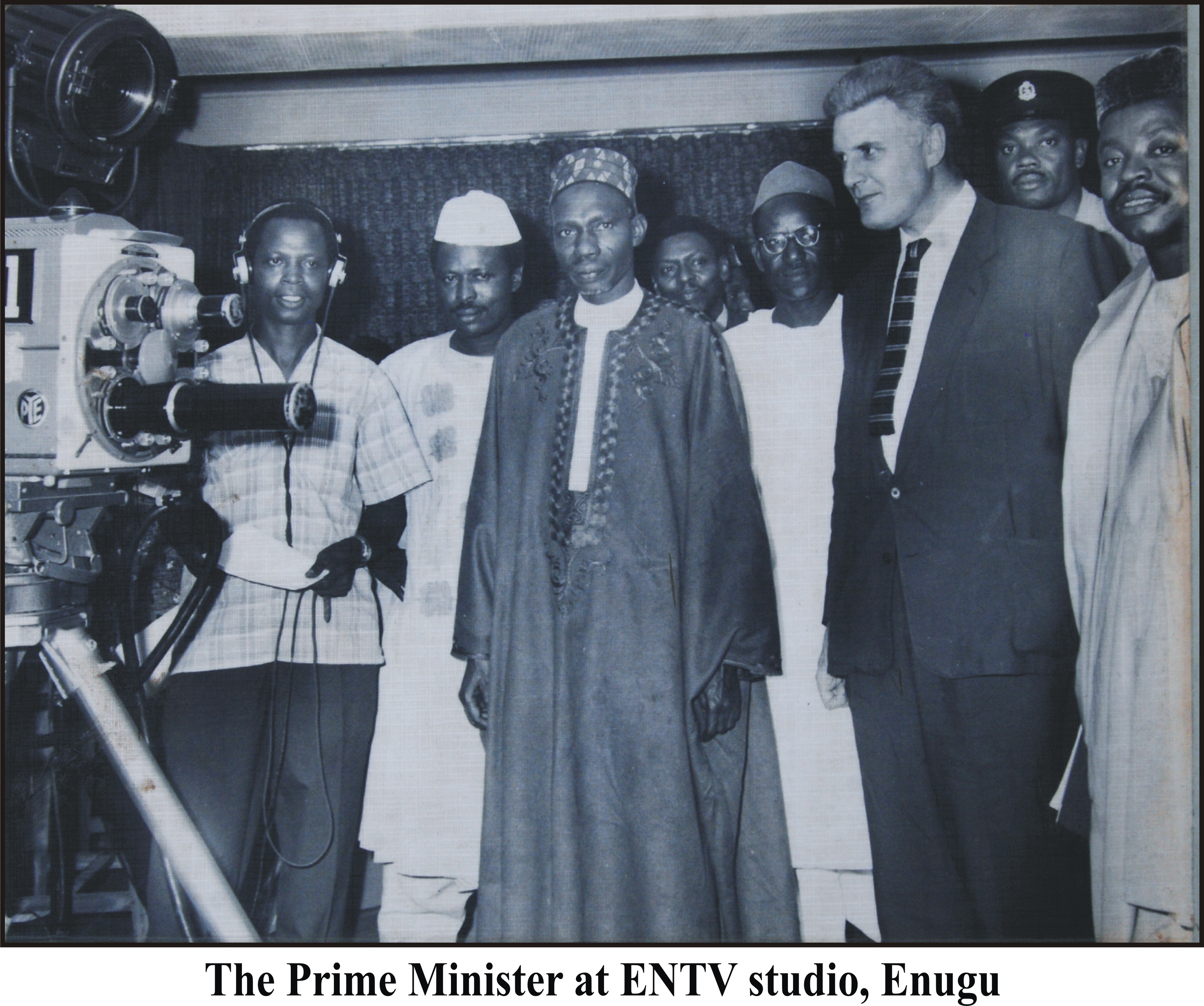 A photo of the prime minister of Nigeria, Late Sir Abubakar Tafawa Balewa and the staff of ENTV Studio, Enugu.