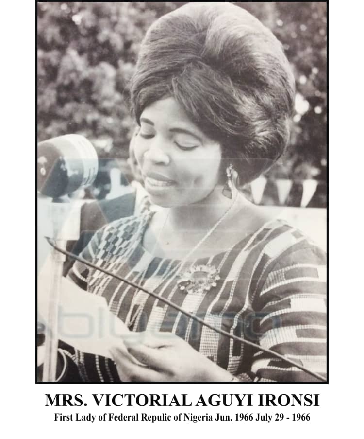 Victoria Nwanyiocha Aguyi-Ironsi (21 November 1923 – 23 August 2021) was the second First Lady of Nigeria from 16 January 1966 to 29 July 1966. Wife of the late Johnson Aguiyi-Ironsi, first Nigerian military head of state