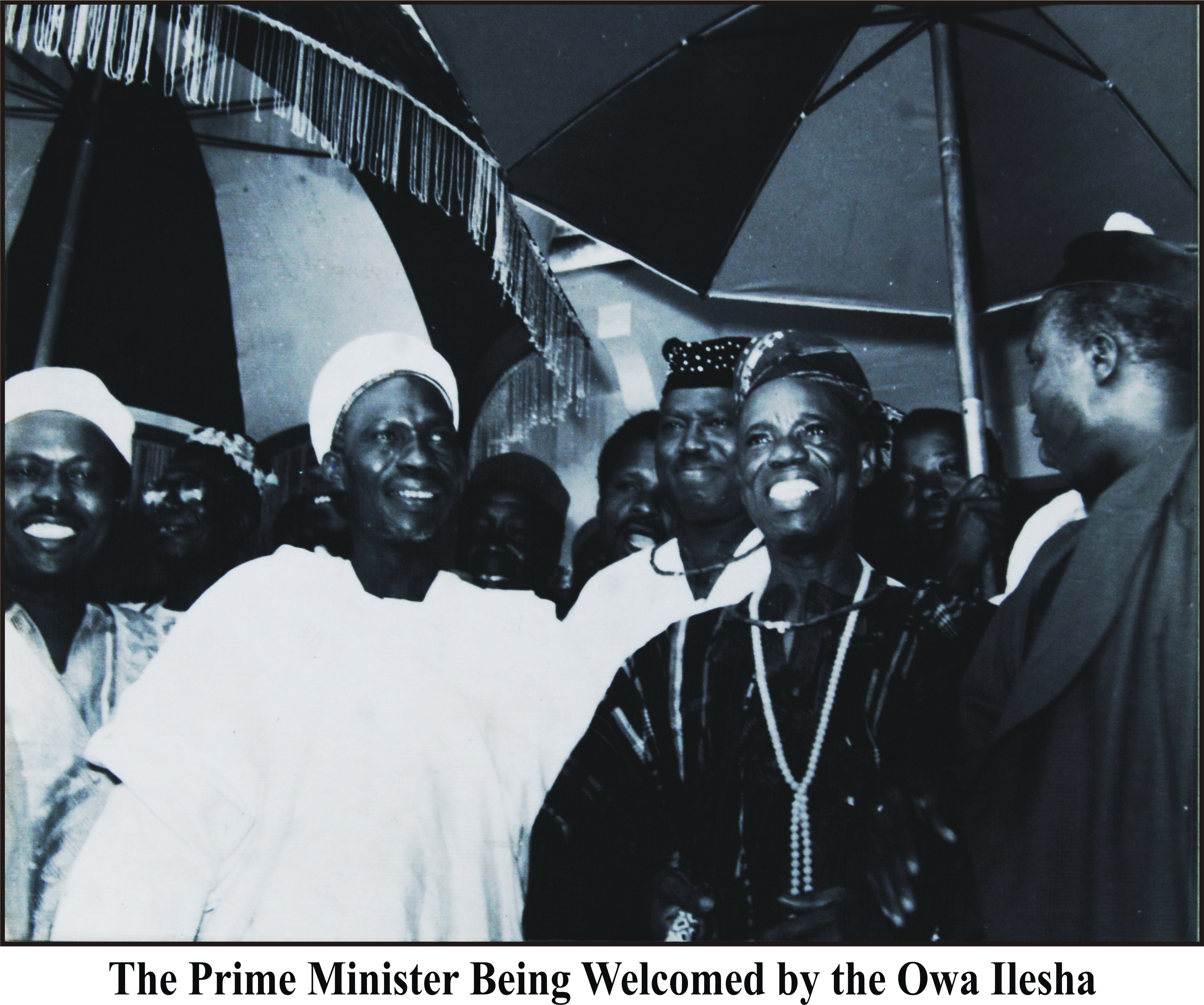 This is the picture of the prime minister late Sir Abubakar Tafawa Balewa being welcomed by the Owa Ilesha and other dignitaries.