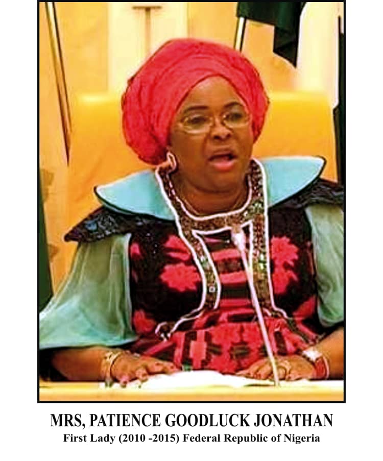 Dame Patience Faka Jonathan (née Iwari)(born 25 October 1957) is a Nigerian civil servant who served as the First Lady of Nigeria from 2010 to 2015 and second lady of Nigeria from 2007 to 2010. She is the wife of former president and Vice president of Nigeria Goodluck Ebele Jonathan.