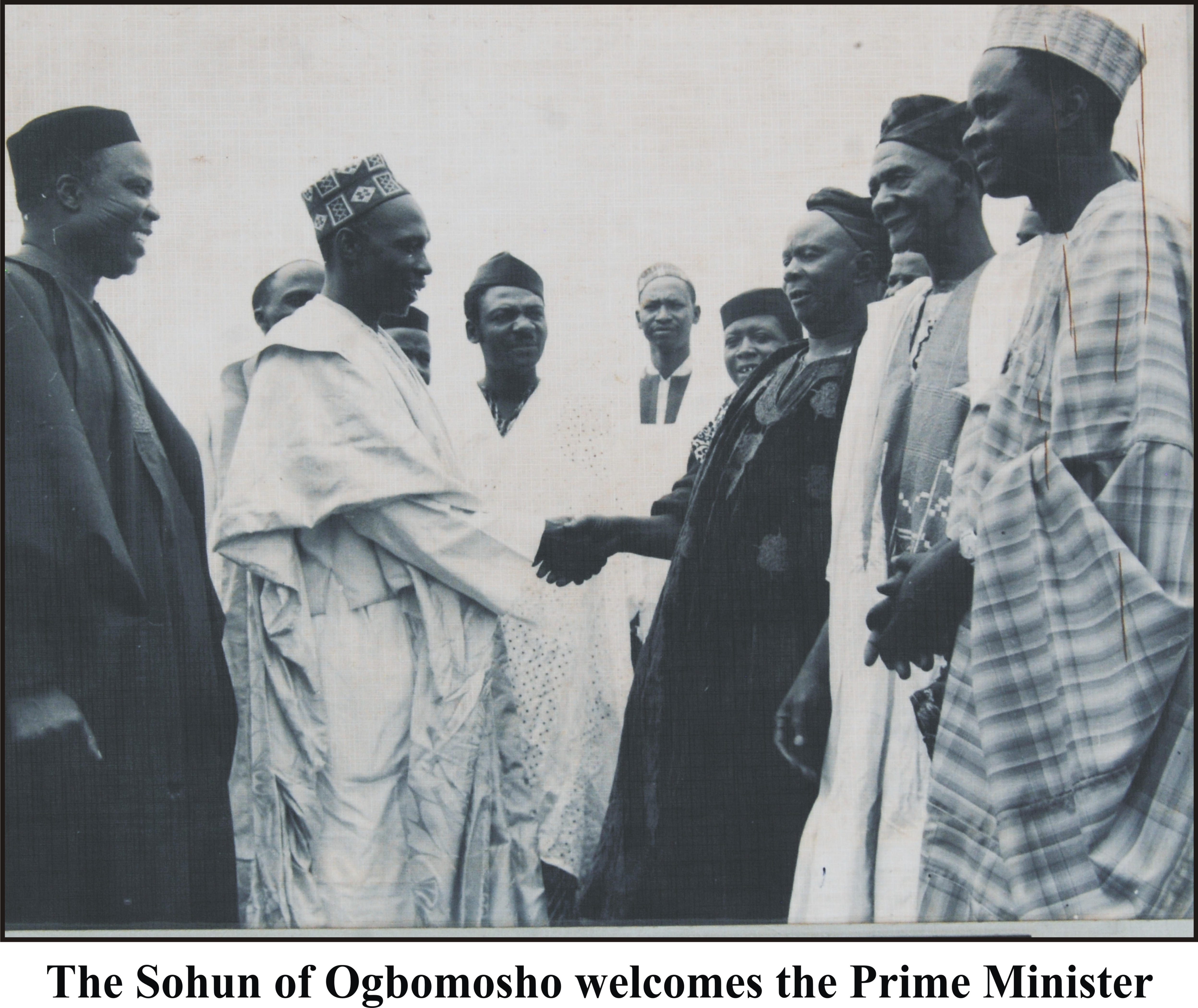 This is the Picture of The Soun of Ogbomosho welcomes the Prime Minister. late Sir Abubakar Tafawa Balewa and other dignitaries